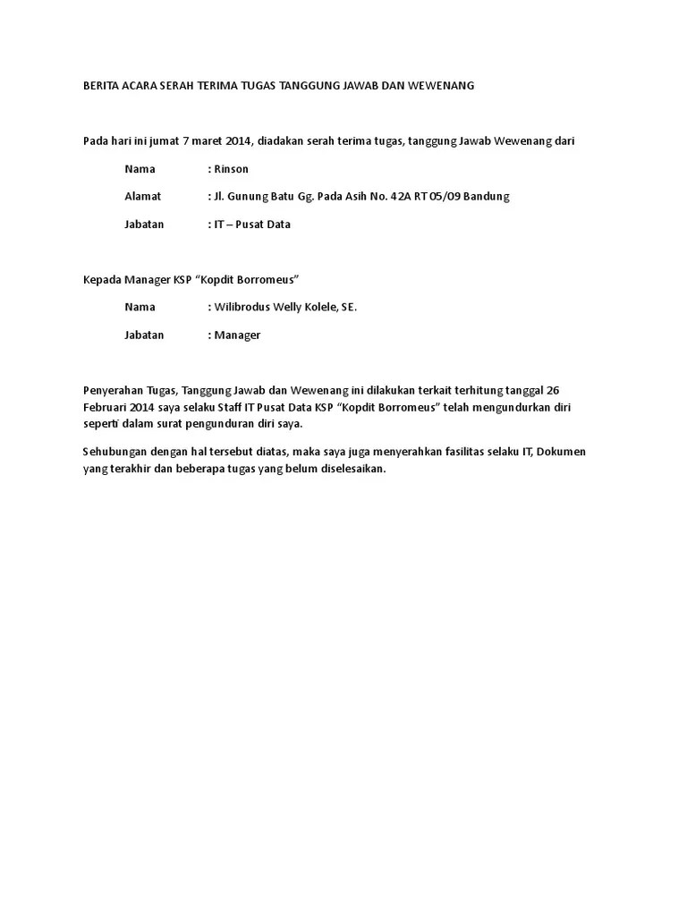 Urusan resign tidak sekadar mengirimkan surat pengunduran diri. Contoh surat serah terima pekerjaan karena resign. 23), berita acara adalah risalah suatu peristiwa resmi dan tertulis mengenai penyerahan dan. Form serah terima pekerjaan by wijayanto_jr. Contoh soal akuntansi dasar untuk tes . 12 desain terkait dengan contoh surat serah terima pekerjaan karena resign. Di perusahaan, karena cuti, serah terima pekerjaan, surat serah. Menjelang hari terakhir, kamu perlu memulai proses serah terima pekerjaan . Raya wangi teh melati km. Tentunya, jika kamu ingin resign dari kantor lama, kamu tidak bisa meninggalkannya begitu saja tanpa sepatah kata. Dengan adanya berita acara serah terima pekerjaan ini maka pihak kedua telah melaksanakan kewajiban. 13 contoh surat pengunduran diri dari pekerjaan yang baik. Contoh format surat serah terima pekerjaan karena resign terkadang ada beberapa alasan yang memaksa seseorang harus mengundurkan diri resign .